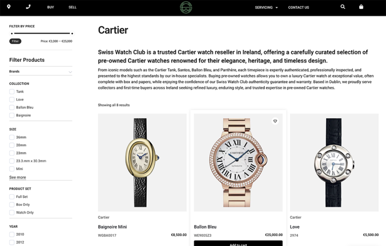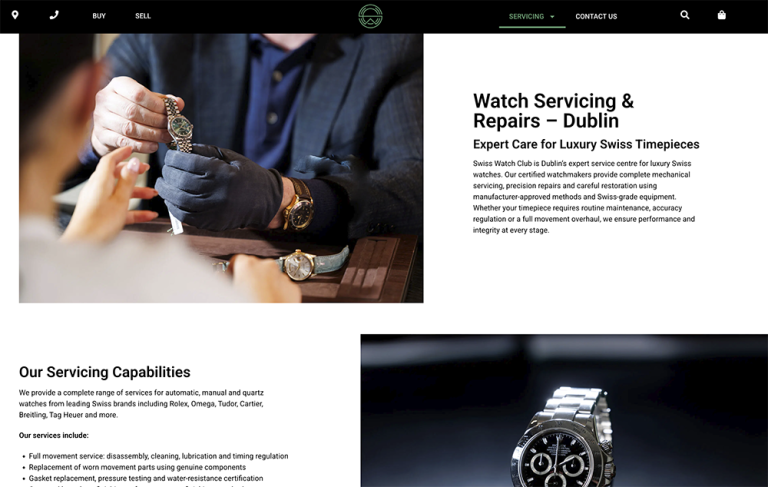 Swiss Watch Club is a leading Dublin-based retailer specialising in sourcing, authenticating, servicing, and selling pre-owned luxury Swiss watches from iconic brands such as Rolex, Omega, Cartier, and Patek Philippe. While the business had a strong reputation offline and positive customer feedback, its digital presence did not reflect the premium nature of its product offering and customer experience. Key issues included an outdated visual identity, limited storytelling around authentication and servicing expertise, and a website structure that made it difficult for visitors to explore the breadth and quality of the watch collection.